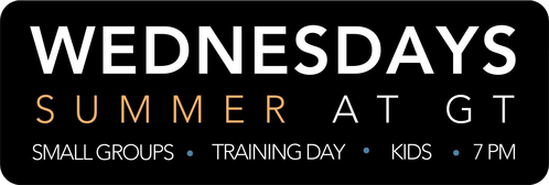 Our spring small groups are just finishing up, and they will conclude the week of June 28th, but if you would like to jump into a small group right now to check it out, you are more than welcome, click here. Over 15 new small groups will kick off in September. GT Youth (grades 6th-12) and GT KIDS (birth to 5th grade) is on every Wednesday night at the same time at 7pm.